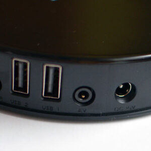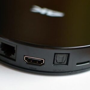 Wszystkie złącza i porty umieszczono na krawędzi urządzenia. Są to: 2 x USB 2.0, AV, DC-IN, LAN, HDMI (w wersji 1.4), złącze optyczne, czytnik kart TF oraz port Micro USB. Rozlokowano je w bezpiecznych odstępach, a więc nie powinno być problemu z podłączeniem wielu wtyczek jednocześnie. Tuż obok producent umieścił jeszcze przycisk power, który jest jedynym fizycznym guziczkiem na obudowie urządzenia.
